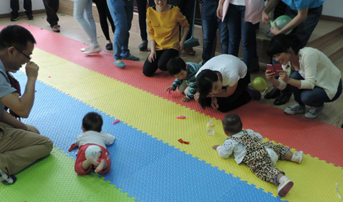 踩氣球 如果說趣味活動進入高潮的是踩氣球比賽,哈哈最為精彩是在爭奪冠亞軍、季軍的決賽中,那個叫“你死我活”,在榮譽面前,決不手下軟,腳下也不會留情,你瞅方芹芹阿姨帶著兒子,那個叫“狠、準(zhǔn)”,一腳下去就讓把第三名摟入懷中,競爭者,你就得靠邊吧。沒事有機會,還有下一個節(jié)目呢。 最后一節(jié)目那是最為精彩,兩個只有幾個月的小寶寶,放在地板上爬行比賽,可是人家太小了嘛,怎么比賽嘛,表演一下倒是可以的,讓趴就趴,讓躺就躺,做個哭的表情也是可以的,還問為什么?就因為咱小?就因為咱參加人數(shù)少就不設(shè)比賽項目嗎?真是的,這樣咱倆一個一等獎一個二等獎多好,幾個月就給爹娘爭榮譽創(chuàng)福利了!不給獎是吧,不和你們玩了!