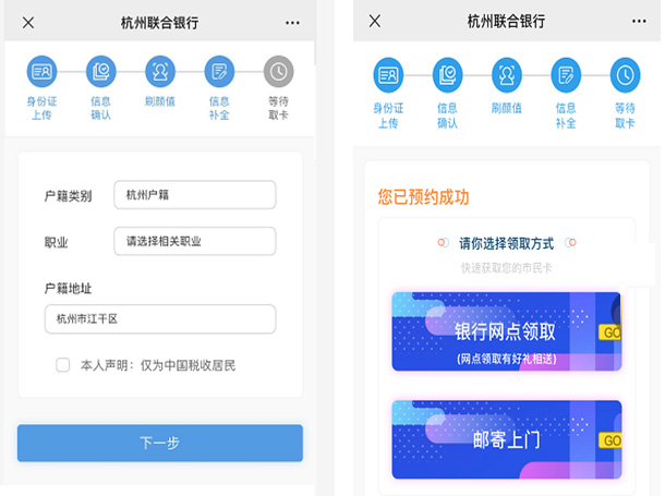 2、填寫個人信息時,選擇自己就近的杭州聯合銀行,方便領卡和激活