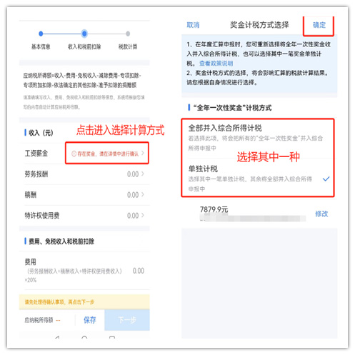 在申報(bào)中,辦理個(gè)稅匯算面臨全年一次性獎(jiǎng)金計(jì)稅方式的兩大選擇:全部并入綜合所得計(jì)稅和單獨(dú)計(jì)稅。