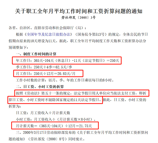二、職工全年月平均工作時(shí)間和工資折算(新算法): 1、制度工作時(shí)間的計(jì)算 (1)年工作日:365天-104天(休息日)-13天(法定節(jié)假日)=248天 (2)季工作日:248天÷4季=62天/季 (3)月工作日:248天÷12月=20.67天/月 (4)工作小時(shí)數(shù)的計(jì)算:以月、季、年的工作日乘以每日的8小時(shí) 2、日工資、小時(shí)工資的折算 按照《勞動(dòng)法》第五十一條的規(guī)定,法定節(jié)假日用人單位應(yīng)當(dāng)依法支付工資,即折算日工資、小時(shí)工資時(shí)不剔除國(guó)家規(guī)定的13天法定節(jié)假日。據(jù)此,日工資、小時(shí)工資的折算為: (1)日工資:月工資收入÷月計(jì)薪天數(shù) (2)小時(shí)工資:月工資收入÷(月計(jì)薪天數(shù)×8小時(shí)) (3)月計(jì)薪天數(shù)=(365天-104天)÷12月=21.75天 可以看到的是,月工資計(jì)算天數(shù)沒有變化。 加班工資計(jì)算 依據(jù)《工資支付暫行規(guī)定》第十三條:用人單位在勞動(dòng)者完成勞動(dòng)定額或規(guī)定的工作任務(wù)后,根據(jù)實(shí)際需要安排勞動(dòng)者在法定標(biāo)準(zhǔn)工作時(shí)間以外工作的,應(yīng)按以下標(biāo)準(zhǔn)支付工資: (一)安排勞動(dòng)者延長(zhǎng)平日工作時(shí)間的,支付勞動(dòng)者工資的150%的工資報(bào)酬; (二)休息日安排勞動(dòng)者工作又不能安排補(bǔ)休的,支付勞動(dòng)者工資的200%的工資報(bào)酬; (三)法定休假日安排勞動(dòng)者工作的,支付勞動(dòng)者工資的300%的工資報(bào)酬。 目前現(xiàn)行算法是: 加班工資=月薪÷21.75×加班天數(shù)×所對(duì)應(yīng)的倍數(shù) 以上“工資”指的是勞動(dòng)合同所簽訂的總額,如果勞動(dòng)合同的工資分為“基本工資”、“崗位工資”、“職務(wù)工資”等,應(yīng)當(dāng)以各項(xiàng)工資的總和作為基數(shù)計(jì)發(fā)加班費(fèi)(包含獎(jiǎng)金、津貼、補(bǔ)貼等),不能以單獨(dú)一項(xiàng)作為計(jì)算基數(shù)。 |