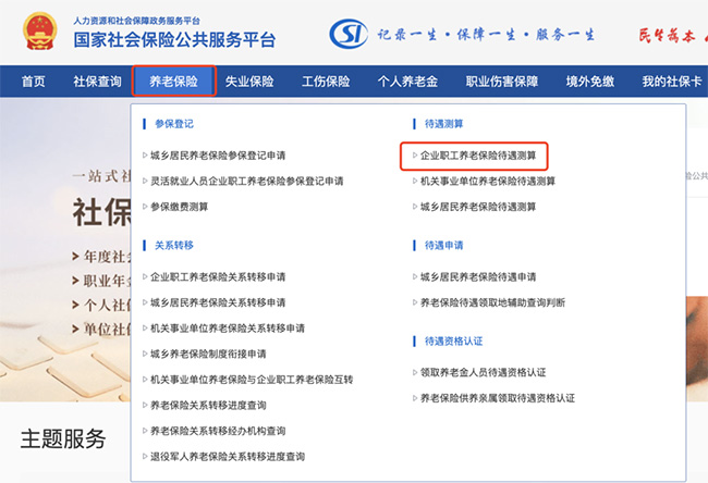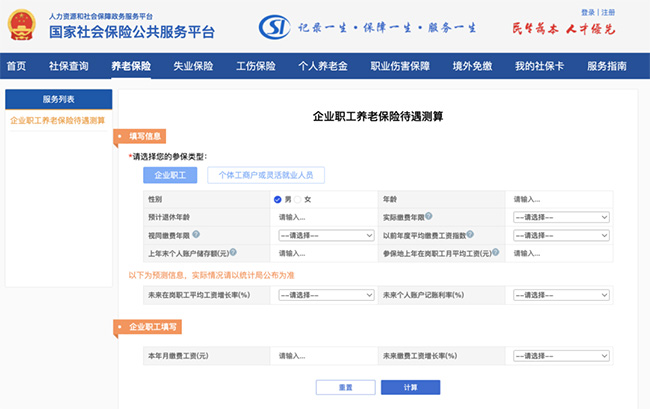 1、養老金測算公式 養老金計算公式:每月到手的養老金=月基礎養老金+月個人賬戶養老金 其中: (1)月基礎養老金=(全省上年度所有職工的月平均工資+本人指數化月平均繳費工資)÷2×繳費年限×1% (2)個人賬戶養老金=個人賬戶的余額÷計發月數(50歲為195、55歲為170、60歲為139) 2、月薪5000元,繳滿20年社保 退休能領多少養老金? 假設某位青島月薪5000元的男性,43歲才開始繳納社保,到63歲退休時正好繳滿20年。那他退休后能拿到多少養老金? 根據顯示,2023年度青島的平均工資為7910元/月。 另外,還需要假設幾個參數,工資增長率和個人賬戶記賬利率,通常都填入3%,方便計算器計算。 注:這個是預估數據,實際情況可能會有差別 現在,我們根據上面的基礎信息,一起來算一算: 第一步:登錄“國家社會保險公共服務平臺”,找到“養老保險—企業職工養老保險待遇測算”。