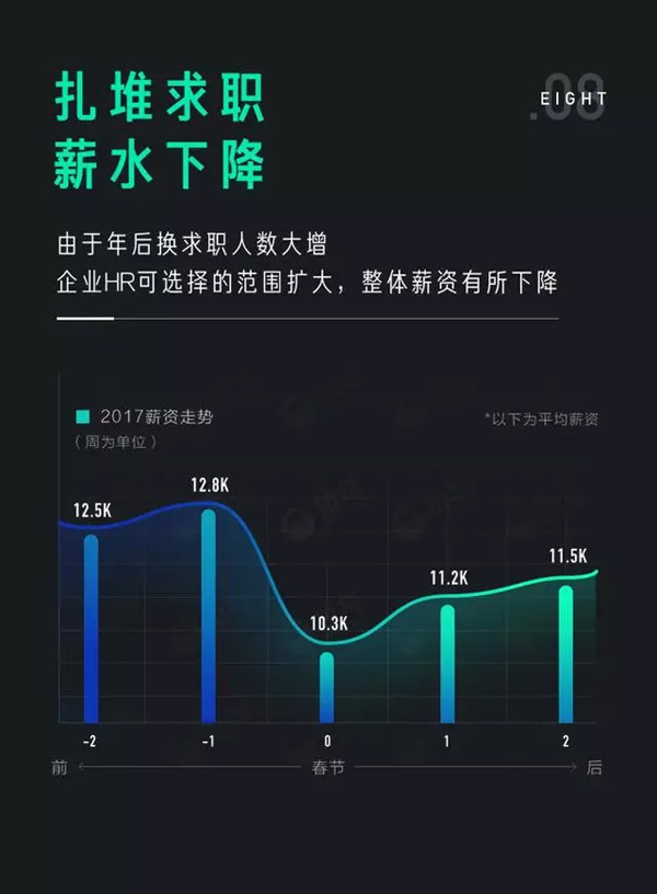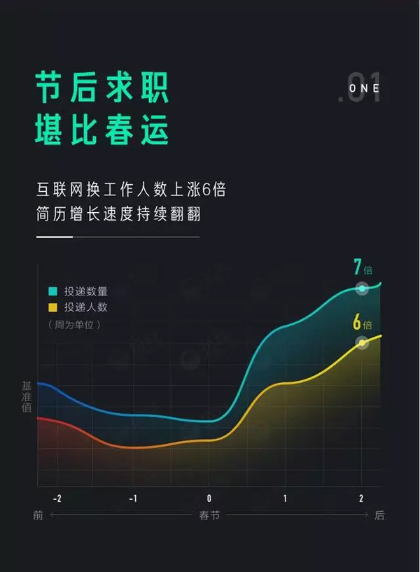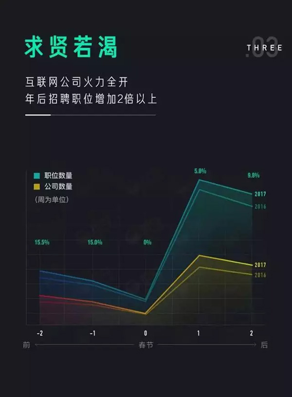 ▲ 從這張圖中可以看到,2017年節(jié)后,求職人數(shù)和簡歷投遞量漲勢明顯,年后換工作成為互聯(lián)網(wǎng)人的常態(tài)。