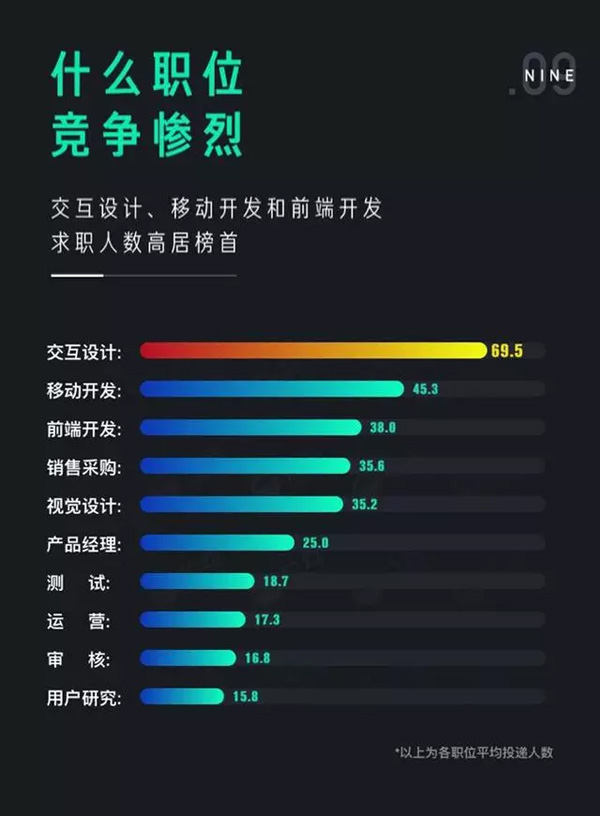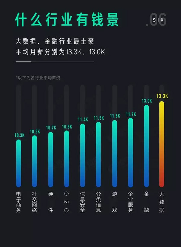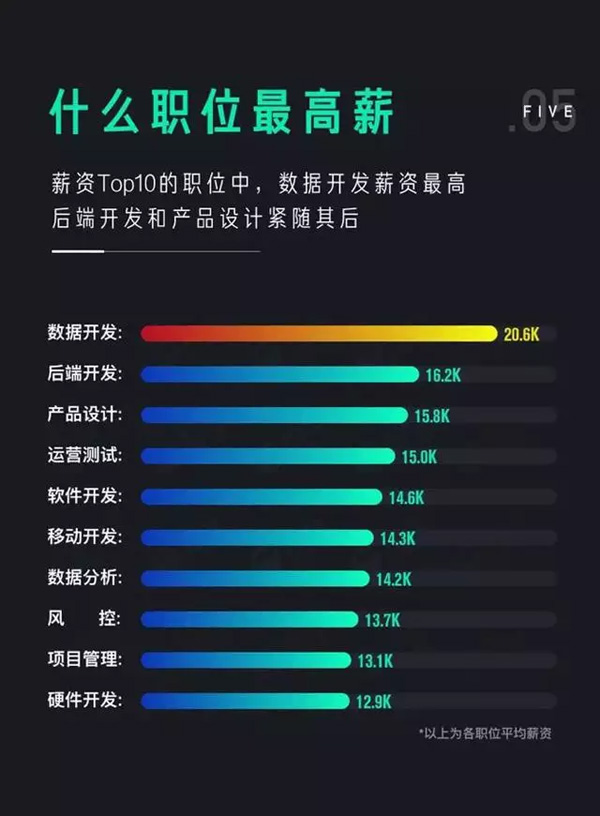 ▲ 數(shù)據(jù)開發(fā)、后端開發(fā)、產(chǎn)品設(shè)計以20.6k、16.2k、15.8k的平均月薪,成為最高薪的三大互聯(lián)網(wǎng)行業(yè)。
