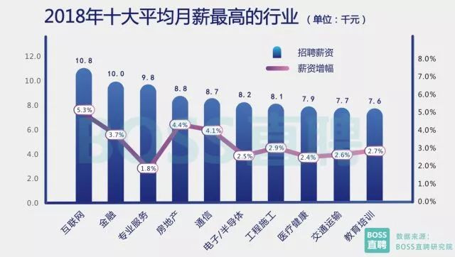 隨著第三產業在我國GDP中所占比重的連年提升,特別是城市服務業的迅猛發展以及社會消費意愿的提升, 不僅僅是一線城市,二三線城市的生活服務業同樣出現較大的崗位空缺,“用工荒”現象在開年后較為明顯。 而在求職旺季,工程施工相關人才的相對緊缺,一定程度上反映出“一帶一路”大背景下,基建項目整體需求的提升,以及基建投資在今年“降速提效”的新特征。 產業間薪酬分化進一步加劇 BOSS直聘研究院數據顯示,2018年前兩個月,各產業間平均薪資水平的分化進一步加劇,排名第一的互聯 網行業,平均薪酬是排名末尾的食品/飲料行業的1.79倍,較2017年同期增加0.06倍。 傳統高薪三巨頭行業互聯網、金融、專業服務穩坐前三,平均月薪較其他行業高出1000元以上。 房地產、通信互換位置,排名四五, 雖然在薪資基數上與前三仍有差距,但薪資增幅僅以微弱劣勢稍低于互聯網。