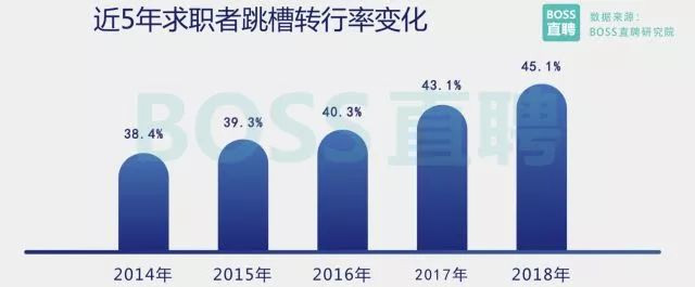 BOSS直聘研究院發現,石油/石化和采掘/冶煉行業人才的流入/流出比連續三年下降,2018年跌破0.75。 而過去幾年人才吸引力尚能保持在中游位置的傳統媒體,人才流失率首次進入倒數五位。 人才轉行情況更加普遍 產業間流動迅速增長 隨著新興行業的崛起以及行業間薪酬分化加劇,人才轉行率正加速上升。 BOSS直聘研究院數據顯示,2018 年,全行業人才整體轉行率已達45.1%,較5年前增加近7個百分點,轉行現象正變得愈發普遍,產業間的人才流 動正在迅速增長。