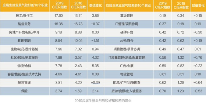 就業(yè)形勢最好的行業(yè)依然是中介服務(wù),CIER指數(shù)比去年同期高3.59,漲勢迅猛。從供需兩側(cè)來看,這一行業(yè)的需求人數(shù)同比上升25%,求職人數(shù)下降了21%,中介服務(wù)行業(yè)的快速發(fā)展持續(xù)釋放招聘需求,但不管是應(yīng)屆生還是社招群體,都對這一行業(yè)的就業(yè)體驗認可度不高,投遞行為不積極。此外,教育培訓、醫(yī)藥/生物工程、房地產(chǎn)/建筑/建材/工程、互聯(lián)網(wǎng)/電子商務(wù)等行業(yè)的應(yīng)屆生就業(yè)景氣度都名列前茅,但值得注意的是,互聯(lián)網(wǎng)/電子商務(wù)行業(yè)的就業(yè)景氣度有小幅同比下滑,源于這個行業(yè)需求人數(shù)同比下降了32%,投遞人數(shù)同比下降了11%。 在就業(yè)景氣度最差的十個行業(yè)中,航空/航天研究與制造、跨領(lǐng)域經(jīng)營、能源/礦產(chǎn)/采掘/冶煉等行業(yè)針對應(yīng)屆生的就業(yè)景氣度較差,且十個行業(yè)的景氣度普遍低于去年,僅辦公用品及設(shè)備行業(yè)景氣度有小幅上升。 (1)中介服務(wù)行業(yè)持續(xù)釋放需求 近年來,隨著服務(wù)經(jīng)濟的發(fā)展,中介服務(wù)行業(yè)出于自身發(fā)展也十分渴求人才,由于這一行業(yè)現(xiàn)階段招聘門檻不高,因此對沒有工作經(jīng)驗的應(yīng)屆生接納程度也比較高,今年該行業(yè)的企業(yè)招聘需求同比增長25%。需求上漲的同時,在這個行業(yè)求職的大學生數(shù)量卻在減少,2019屆應(yīng)屆生投遞中介服務(wù)行業(yè)的人數(shù)同比減少21%。這一極端的供需關(guān)系導致人才缺口進一步拉開,CIER指數(shù)較去年進一步提升,從6.23提升至9.82。 智聯(lián)招聘建議,作為招聘方應(yīng)該考慮如何優(yōu)化雇傭關(guān)系來吸引人才的關(guān)注,該行業(yè)市場化程度較高,職業(yè)發(fā)展速度快,但也急需從傳統(tǒng)的中介思路向顧問式服務(wù)轉(zhuǎn)型,為知識型人才提供更多的施展空間。 (2)互聯(lián)網(wǎng)行業(yè)回歸理性,應(yīng)屆生求職應(yīng)避免“扎堆” 互聯(lián)網(wǎng)行業(yè)連續(xù)幾個季度就業(yè)景氣度遇冷,在今年的大學生就業(yè)方面也不例外的同比下滑,CIER指數(shù)從去年的3.35降至今年的2.54,排名跌至第5位。 智聯(lián)招聘的調(diào)研數(shù)據(jù)顯示,2019年應(yīng)屆生擇業(yè)時,互聯(lián)網(wǎng)/電子商務(wù)行業(yè)依然是吸引最多求職者的行業(yè)。目前,互聯(lián)網(wǎng)行業(yè)依然被貼上高薪、福利好、文化開放的標簽,依然是求職者的首選,尤其是大學生群體,在選擇職業(yè)時容易盲目追熱,缺少理性決策,更容易出現(xiàn)“扎堆”現(xiàn)象,因此高校或社會機構(gòu)也應(yīng)該給這一人群提供更全面的就業(yè)信息咨詢,引導人才合理向人才緊缺的實體經(jīng)濟領(lǐng)域流動。 (3)外包服務(wù)行業(yè)值得關(guān)注 服務(wù)外包產(chǎn)業(yè)是現(xiàn)代高端服務(wù)業(yè)的重要組成部分,同樣受益于服務(wù)經(jīng)濟的帶動,同時符合靈活用工的趨勢,越來越多的企業(yè)傾向于把非核心業(yè)務(wù)外包,從而提高內(nèi)部團隊的工作能效并節(jié)約成本。 外包服務(wù)行業(yè)正處于快速發(fā)展階段,并持續(xù)釋放工作機會,針對應(yīng)屆生而言,外包服務(wù)行業(yè)CIER指數(shù)從去年春季的1.85上升至今年的1.97。需求人數(shù)增長11%,求職人數(shù)增長4%,呈現(xiàn)出雙向繁榮的態(tài)勢。 當前的外包服務(wù)市場中以信息技術(shù)為主,這類公司承接的項目種類豐富且實操機會多,是應(yīng)屆生快速積累經(jīng)驗的好平臺,擁有信息技術(shù)、人力資源、財會等技能的畢業(yè)生不妨多關(guān)注這個行業(yè)的機會。 3、應(yīng)屆生在銷售類崗位容易就業(yè);管理類崗位競爭存在挑戰(zhàn)