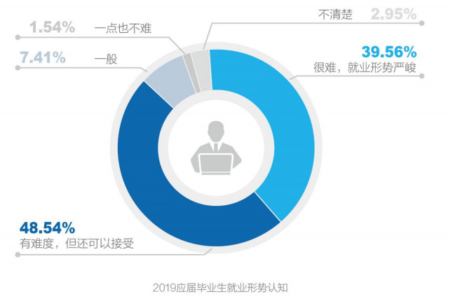 上表反應(yīng)的是應(yīng)屆生在不同職業(yè)的就業(yè)景氣度,其中排名第一的是技工/操作工,CIER指數(shù)為17.60,呈現(xiàn)出“用工荒”的局面,這一崗位針對應(yīng)屆生的需求同比上升37%,投遞人數(shù)同比上升7%,遠遠無法滿足需求的增長速度。 除此之外,銷售類崗位在就業(yè)景氣度前十的職業(yè)中比較集中,如銷售業(yè)務(wù)、客服/售前/售后技術(shù)支持、銷售管理等,這類對經(jīng)驗、技能要求不高的崗位更容易向應(yīng)屆生開放。 值得關(guān)注的是,社區(qū)/居民/家政服務(wù)、物流/倉儲這兩個職位就業(yè)景氣度較去年漲幅較大,與技工/操作工性質(zhì)一樣,這類傳統(tǒng)觀念中偏“藍領(lǐng)”屬性的崗位,在大學生這一知識型人群中普遍不受青睞,但服務(wù)業(yè)的發(fā)展讓這類崗位對人才的素質(zhì)要求不斷攀升,導致應(yīng)屆生在這一領(lǐng)域供不應(yīng)求的現(xiàn)象加劇。高校等教育機構(gòu)應(yīng)加強對大學生的就業(yè)理念指導,減輕當前存在的就業(yè)崗位歧視,應(yīng)以實現(xiàn)自身價值為導向。 4、民營、合資企業(yè)景氣度走高,民營企業(yè)成應(yīng)屆生就業(yè)大本營 民營企業(yè)、合資企業(yè)和股份制企業(yè)的大學生就業(yè)景氣度較高,且高于去年同期,分別為0.87、0.83和0.56,其中,民營企業(yè)的需求人數(shù)同比上升3%,投遞人數(shù)卻在下降。 2019年大學生就業(yè)景氣度明顯低于去年的是上市公司,CIER指數(shù)從0.78降為0.33;其次是國企,國企在需求人數(shù)下降19%的基礎(chǔ)上,投遞人數(shù)卻增加了5%。 5、小微企業(yè)持續(xù)釋放就業(yè)活力 整體來看,小微企業(yè)的應(yīng)屆生就業(yè)景氣度較高。其中,20-99人規(guī)模的企業(yè)CIER指數(shù)達到0.78排在首位。萬人以上規(guī)模的超大型企業(yè)今年CIER指數(shù)雖然不是最低,但下降幅度較大,針對應(yīng)屆生的需求人數(shù)同比下降了37%,而求職人數(shù)卻上升了11%。 從應(yīng)屆生的就業(yè)意愿來看,更多的求職者涌入了規(guī)模較大的企業(yè),但20人以下的微型企業(yè)的應(yīng)屆生求職人數(shù)卻在腰斬,這類企業(yè)對應(yīng)屆生的吸引力依然不足。 二、大學生求職認知及心態(tài)調(diào)研 2019年高校畢業(yè)生預計高達834萬,同比2018年,全國普通高校畢業(yè)生人數(shù)增加14萬,再創(chuàng)歷史新高,大學生求職面臨挑戰(zhàn)與機遇并存的情況。更激烈的競爭也讓大學生的求職心態(tài)持續(xù)發(fā)生變化。 1、就業(yè)難度感知略有上升 根據(jù)調(diào)研結(jié)果,2019應(yīng)屆畢業(yè)生對就業(yè)難度形勢的感知較去年更加凸顯,認同就業(yè)形勢有難度的比例為88.10%,較去年同期上升5.30個百分點。具體來看,39.56%認為“很難,就業(yè)形勢嚴峻”,48.54%認為“有難度,但還可以接受”,7.41%表示就業(yè)難度“一般”,認為就業(yè)“一點也不難”的占比僅為1.54%,2.95%表示“不清楚”。