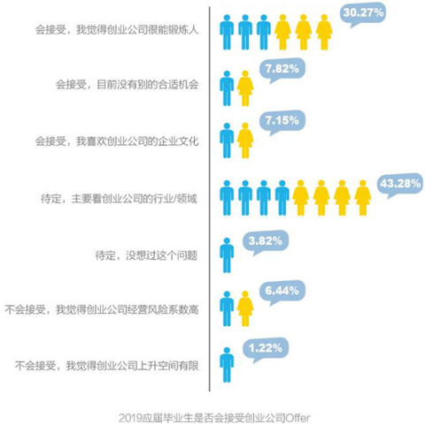 2、“慢就業(yè)”現(xiàn)象加劇,部分應(yīng)屆生逃避就業(yè)挑戰(zhàn) 在參與本次調(diào)研的2019應(yīng)屆畢業(yè)生當中,80.22%的大學生選擇畢業(yè)后直接就業(yè),同比2018年基本持平;8.00%的大學生選擇慢就業(yè),較去年同期上升1.01個百分點;7.11%的大學生選擇國內(nèi)繼續(xù)學習,較去年同期上升2.13個百分點。雖然絕大部分應(yīng)屆畢業(yè)生積極主動的投入到求職大軍當中,但選擇逃避就業(yè)壓力的畢業(yè)生占比也在緩慢上升。 此外選擇創(chuàng)業(yè)的大學生占比為2.40%,較去年同期下降2.38個百分點;1.05%的大學生選擇出國繼續(xù)學習,較去年同期下降1.58個百分點。可見高校畢業(yè)生們對于未來的職業(yè)規(guī)劃更加趨于謹慎,就業(yè)仍是2019應(yīng)屆畢業(yè)生的首選。 從不同學校類型的數(shù)據(jù)來看,非雙一流院校畢業(yè)生的就業(yè)意愿要明顯高于雙一流院校,雙一流院校畢業(yè)生選擇就業(yè)的占比為75.97%,而非雙一流院校的就業(yè)占比高達82.33%,雙一流院校擁有更好的教育資源,應(yīng)屆畢業(yè)生在畢業(yè)去向的選擇上也更加多元,雙一流院校畢業(yè)生選擇國內(nèi)繼續(xù)學習的占比為8.96%,出國繼續(xù)學習的占比為3.49%,創(chuàng)業(yè)的占比為2.95%,均高于非雙一流院校的數(shù)據(jù)。 3、小平臺也能有大作為,近半應(yīng)屆生認可創(chuàng)業(yè)公司 創(chuàng)業(yè)公司一直被認為辛苦且工作壓力大,但調(diào)研結(jié)果顯示,45.24%的應(yīng)屆畢業(yè)生表示會接受創(chuàng)業(yè)公司的offer,43.28%的高校畢業(yè)生持觀望態(tài)度,并表示要看創(chuàng)業(yè)公司的行業(yè)/領(lǐng)域而定。 在選擇接受創(chuàng)業(yè)公司的人群中,30.27%是因為創(chuàng)業(yè)公司能鍛煉人,7.82%是因為目前沒有別的合適機會,7.15%是因為喜歡創(chuàng)業(yè)公司的企業(yè)文化。而拒絕創(chuàng)業(yè)公司的主要原因在于覺得創(chuàng)業(yè)公司經(jīng)營風險系數(shù)高。