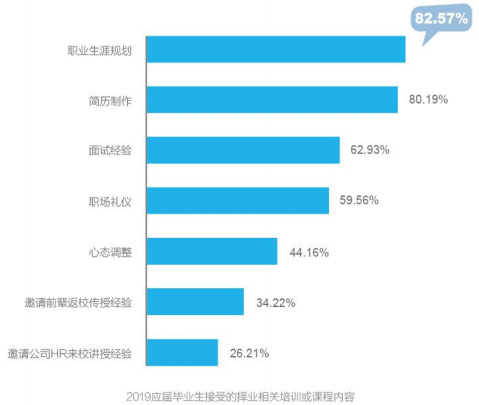 5、求職關(guān)注時間有所提前,求職態(tài)度更加積極主動 調(diào)研數(shù)據(jù)顯示,在2019應(yīng)屆畢業(yè)生中,大二和大三開始關(guān)注求職的學生占比54.49%,大四開始關(guān)注求職的占比31.49%。對比2018年,從大二和大三開始關(guān)注求職的學生比例略有上升;從大四才開始關(guān)注求職的學生比例稍有下降。 6、“海投”人數(shù)明顯下降,95后求職目標更加精確 在參與調(diào)研的2019應(yīng)屆畢業(yè)生中,55.08%投遞簡歷數(shù)為1-10份,占比最高;其次為11-30份,占比25.86%;投遞31-50份的占比6.47%;51份以上的占比7.15%;一份簡歷都未投遞的占比5.44%。 總體來看,2019年參與求職的應(yīng)屆畢業(yè)生當中,投遞簡歷數(shù)11份及以上的合計占比39.48%,與去年同期相比下降29.58%。大學生在求職時選擇“海投”行為的人數(shù)下降,主要和95后的求職特性有關(guān),相對于為了提升面試幾率的“海投”行為,大部分95后更加關(guān)注自己真正喜歡的崗位。 7、超半數(shù)畢業(yè)生接受過擇業(yè)培訓,滿意度有待提升 對于剛進入職場的大學生而言,擇業(yè)培訓是為他們指明方向的必要輔導。據(jù)本次調(diào)研數(shù)據(jù),在2019應(yīng)屆畢業(yè)生中,有55.18%的畢業(yè)生接受過與擇業(yè)相關(guān)的培訓或課程,38.60%的畢業(yè)生表示沒有接受過培訓或課程。 當前大學生擇業(yè)培訓的課程內(nèi)容主要集中在簡歷制作、面試經(jīng)驗、職場禮儀、心態(tài)調(diào)整、職業(yè)生涯規(guī)劃等方面。其中職業(yè)生涯規(guī)劃占比82.57%,簡歷制作占比80.19%,面試經(jīng)驗占比62.93%,職場禮儀占比59.56%,心態(tài)調(diào)整占比44.16%,基本都是實用類干貨,屬于可以快速得到應(yīng)用的技能。