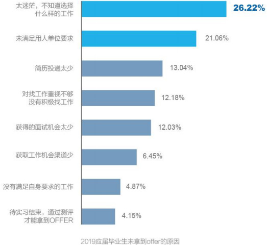 雖然這類課程內(nèi)容豐富,但質(zhì)量還有待提升,僅50.45%的大學生對此類課程內(nèi)容設(shè)計表示滿意,45.97%的大學生并不滿意于擇業(yè)相關(guān)培訓或課程的設(shè)計,3.58%的大學生則希望豐富大學生擇業(yè)相關(guān)培訓或課程的內(nèi)容。 8、近八成畢業(yè)生擁有實習經(jīng)歷 根據(jù)2019應(yīng)屆畢業(yè)生“實習經(jīng)歷對畢業(yè)找工作是否有幫助”的調(diào)研結(jié)果,近乎全票通過,94.62%的應(yīng)屆畢業(yè)生認為實習經(jīng)歷對畢業(yè)找工作是有幫助的。 參與調(diào)研的2019應(yīng)屆畢業(yè)生中,78.22%有過實習經(jīng)歷。實習可幫助大學生加深對公司的了解,確認喜歡或擅長的行業(yè),穩(wěn)固提升專業(yè)技能,為以后的就業(yè)做好鋪墊和提供參考。 三、畢業(yè)生求職效果調(diào)研 1、offer獲取數(shù)同比下降,求職失敗主要源于心態(tài)迷茫 參與調(diào)研的2019應(yīng)屆畢業(yè)生當中,截至2019年3月,24.19%的應(yīng)屆畢業(yè)生尚未獲得任何offer,和去年同期相比數(shù)據(jù)基本持平。對比去年,獲得1-3個offer的占比上升12.01個百分點,獲得6個及以上offer的占比下降15.51個百分點。 針對2019應(yīng)屆畢業(yè)生未拿到offer/錄用通知的主要原因,認為自己“太迷茫”的占比最高,為26.22%。反映出應(yīng)屆畢業(yè)生的求職心態(tài)正在影響求職效果,需要學校進一步加強就業(yè)指導之類的輔導課程,以提升就業(yè)效果。其次是“未滿足用人單位要求”,占比21.06%,企業(yè)在招聘應(yīng)屆生時通常比較看重專業(yè)背景和實習經(jīng)驗,應(yīng)屆生不妨多積累一些實操經(jīng)驗為簡歷增加光彩,并盡量選擇與所學專業(yè)相關(guān)的崗位進行投遞。