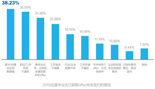 2、簽約率同比小幅上升,未簽約主要因為薪水落差 據(jù)2019應(yīng)屆畢業(yè)生調(diào)研數(shù)據(jù)顯示,截至2019年3月底,明確已經(jīng)簽約的應(yīng)屆畢業(yè)生占比為30.30%,和2018年同比小幅上升1.80個百分點。在offer獲取數(shù)量同比略有下降的情況下,簽約率同比上升,說明今年的應(yīng)屆生更珍惜手中的offer。 關(guān)于尚未簽約的原因,“薪水/待遇未達到期望值”仍是毀約首要因素,比例為38.23%。其次是“職位/工作內(nèi)容不喜歡”和“離畢業(yè)還早,還有機會拿到更好的offer”,占比分別為35.59%和31.36%。