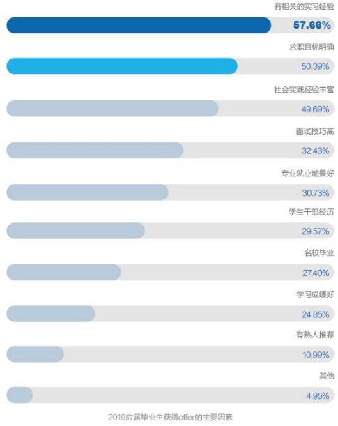 3、實習經(jīng)歷不可或缺,社會實踐經(jīng)驗需要豐富 在已經(jīng)拿到offer的大學生群體中,認為成功獲得offer/錄用通知的主要因素是“有相關(guān)的實習經(jīng)歷”,占比為57.66%,其次是“求職目標明確”和“社會實踐經(jīng)驗豐富”,占比分別為50.39%和49.69%。由此可見,找對方向,憑實操能力勝出是大學生求職成功的關(guān)鍵因素。