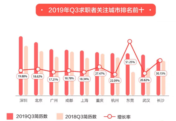 成都則陸續(xù)出臺(tái)《引進(jìn)培育交子金融人才實(shí)施辦法》《重點(diǎn)項(xiàng)目人才開發(fā)指引(2019)》等政策,吸引高學(xué)歷、高技能人才赴蓉共謀發(fā)展,城市的現(xiàn)代化、國(guó)際化水平日益提升,也促進(jìn)企業(yè)招聘更加活躍。 58同城招聘研究院《2019三季度人才流動(dòng)報(bào)告》還反映出,鄭州企業(yè)招聘活躍度同比增幅最大,繼二季度以來(lái)繼續(xù)保持第一的位次。作為中原城市群中心的鄭州,位居“新一線城市”榜全國(guó)第9名,“中國(guó)大陸最佳商業(yè)城市”第12名,持續(xù)提升的城市綜合實(shí)力讓更多企業(yè)聚集于此,招聘熱度不斷提高。 《2019三季度人才流動(dòng)報(bào)告》對(duì)部分城市求職情況進(jìn)行了分析。其中,深圳是求職者最關(guān)注的城市,其次是北京、廣州、成都和上海。深圳作為改革開放的高地和粵港澳大灣區(qū)的建設(shè)重鎮(zhèn),產(chǎn)業(yè)發(fā)達(dá)、收入可觀,成為求職者就業(yè)的“天堂”。 而成都在求職關(guān)注度上超過(guò)上海,與其大力度的人才政策不可分割,2017年7月,成都出臺(tái)《實(shí)施人才優(yōu)先發(fā)展戰(zhàn)略行動(dòng)計(jì)劃》,2年來(lái)吸引28.6萬(wàn)本科及以上人才落戶,充實(shí)了成都的“求職大軍”。 在求職者關(guān)注度增幅上,東莞以51.25%的增長(zhǎng)值一騎絕塵,其次是長(zhǎng)沙、杭州和武漢。由于東莞位于粵港澳大灣區(qū),收入水平高、發(fā)展?jié)摿Υ螅畛杀镜陀谏钲凇V州等城市,受到了眾多求職者的青睞。近年來(lái),長(zhǎng)沙出臺(tái)“人才政策22條”,杭州發(fā)布《關(guān)于加快推進(jìn)杭州人才國(guó)際化的實(shí)施意見》,武漢發(fā)起“四大資智聚漢工程”,吸引精英人才共促區(qū)域發(fā)展,進(jìn)一步提高了當(dāng)?shù)氐那舐殶岫取?/span>