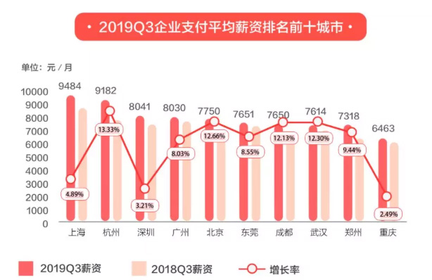 上海企業(yè)平均支付月薪達(dá)9484元,杭州薪資同比增幅最高 58同城招聘研究院《2019三季度人才流動(dòng)報(bào)告》顯示,2019年三季度,企業(yè)支付薪資均有一定程度的上漲。其中,上海企業(yè)平均支付月薪達(dá)9,484元,排名第一,其次是杭州、深圳和廣州。上海是全國(guó)傳統(tǒng)的經(jīng)濟(jì)中心,人均GDP突破2萬(wàn)美元,優(yōu)秀人才為上海企業(yè)創(chuàng)造了巨大的財(cái)富,而企業(yè)也將這些價(jià)值以高薪形式返還給人才。