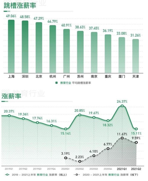 隨著疫情的影響逐漸減退,線下教育市場開始回暖,國家嚴控課外培訓,大家就開始轉型興趣培訓,在“被憋瘋”的家長和小朋友的推動下體育類、音樂類、美術類培訓迎來爆發。市場薪酬漲薪率也在2021年第一、第二季度回到了11.67%、9.59%,雖然沒有回到2019年的平均水平,但是勢頭回來了,面包總會有的,一切都會有的。反觀線上教育,可謂“一地雞毛”,亂象叢生,經歷了洗牌,行業也逐漸回歸理性,2021年第二季度漲薪率也回到了15.11%。