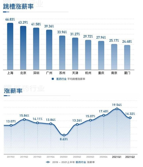 但畢竟數據解讀,還是要看一下市場數據,2021年第一、第二季度的漲薪率達到了19.54%、16.32%,這個數據說明醫藥行業的熱度還沒有褪去,從跳槽漲薪率北上深都超過40%也可以證明。