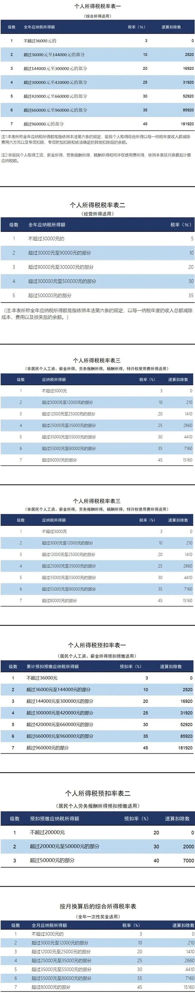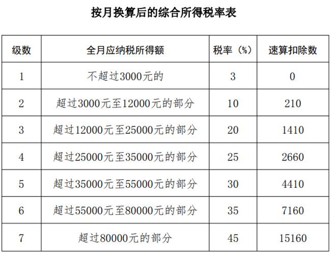 需要注意的是,一個(gè)納稅年度內(nèi),每一個(gè)納稅人只允許使用一次“全年一次性獎(jiǎng)金單獨(dú)計(jì)稅政策"。 5、附最新最全個(gè)稅稅率表