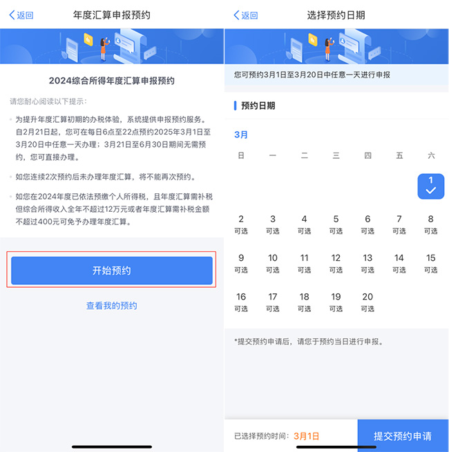 納稅人如需在3月1日至3月20日之間辦理年度匯算,可在2月21日至3月20日每天的早6點至晚22點登錄手機個人所得稅APP進行預約。