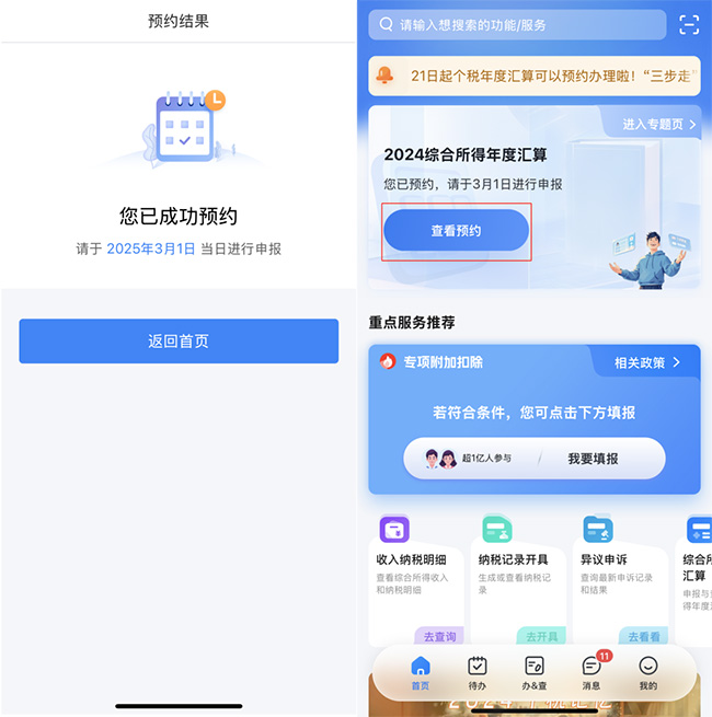 預約成功后,還可在“個人所得稅”APP首頁中的“2024綜合所得年度匯算”中查看預約。